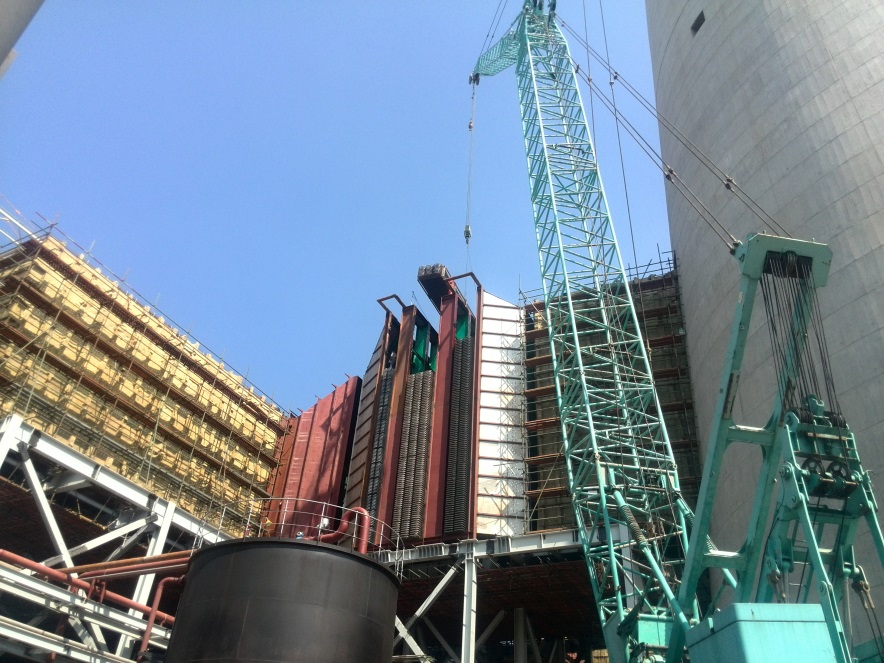 2014年9月,天潤新能源與臺州第二發電有限公司簽訂了總價值約9262萬元的熱媒水管式煙氣放熱器及煙氣再熱器設備采購合同。合同一經簽訂,臺二MGGH項目便緊鑼密鼓開展了起來。MGGH系統輔助設備于2014年春節前陸續到達臺二現場,#1爐所有72個煙氣放熱器模塊以及52個煙氣再熱器模塊也于2015年4月全部送至臺二現場,#2爐所有模塊七月底也已全部送至現場安裝。截止目前,臺二電廠MGGH設備#1爐已經全部安裝調試完成,并于2015年9月14日順利通過電廠168小時性能試驗;#2爐目前已經吊裝完成,現在正在安裝外圍輔助設備,預計十月份正式進入調試階段。如果調試順利,十一月便可以進入168小時調試階段。由電廠反饋回來的#1爐運行數據可以看出,MGGH系統的運行結果完全符合我們的設計要求,煙氣放熱器于煙氣再熱器的進出口煙溫基本與理論計算值相吻合,極大的消除了電廠煙囪“冒白煙”的情況。可以說,自MGGH系統投運之后,肉眼幾乎看不見煙囪有煙冒出來。
